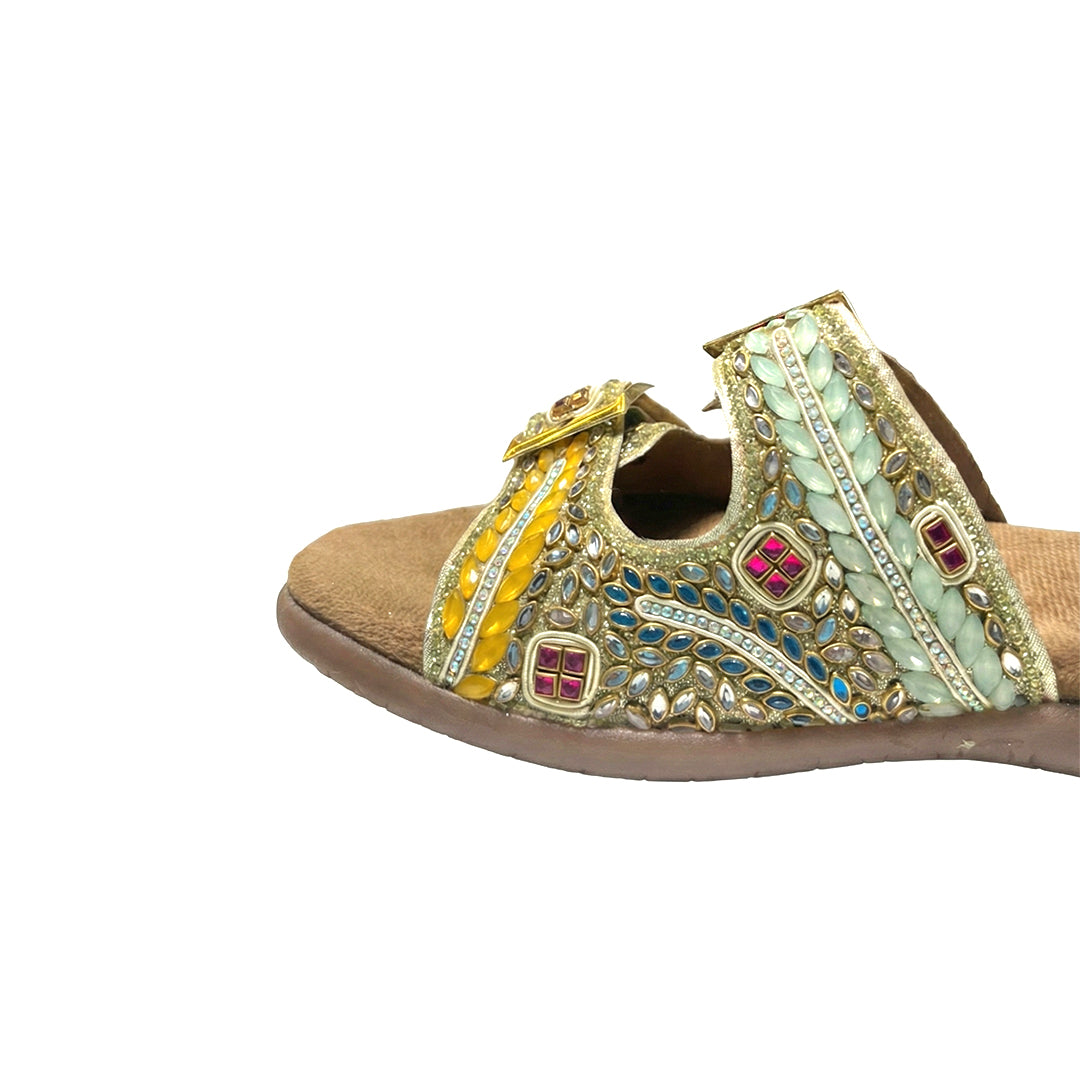 Yellow Mint Kundan Jewel Handwork Buckle flats